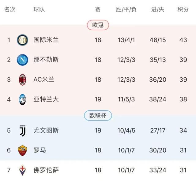 悄无声息地,尤文图斯已经赶了上来。意甲第19轮早场的两场战罢,尤文图斯有惊无险地拿下了卡利亚里,另一边亚特兰大则在客场与热那亚战平。这样半程过后,斑马军团以34分的成绩排名第5,距离欧冠区只差4分,保留了晋级前四的希望。